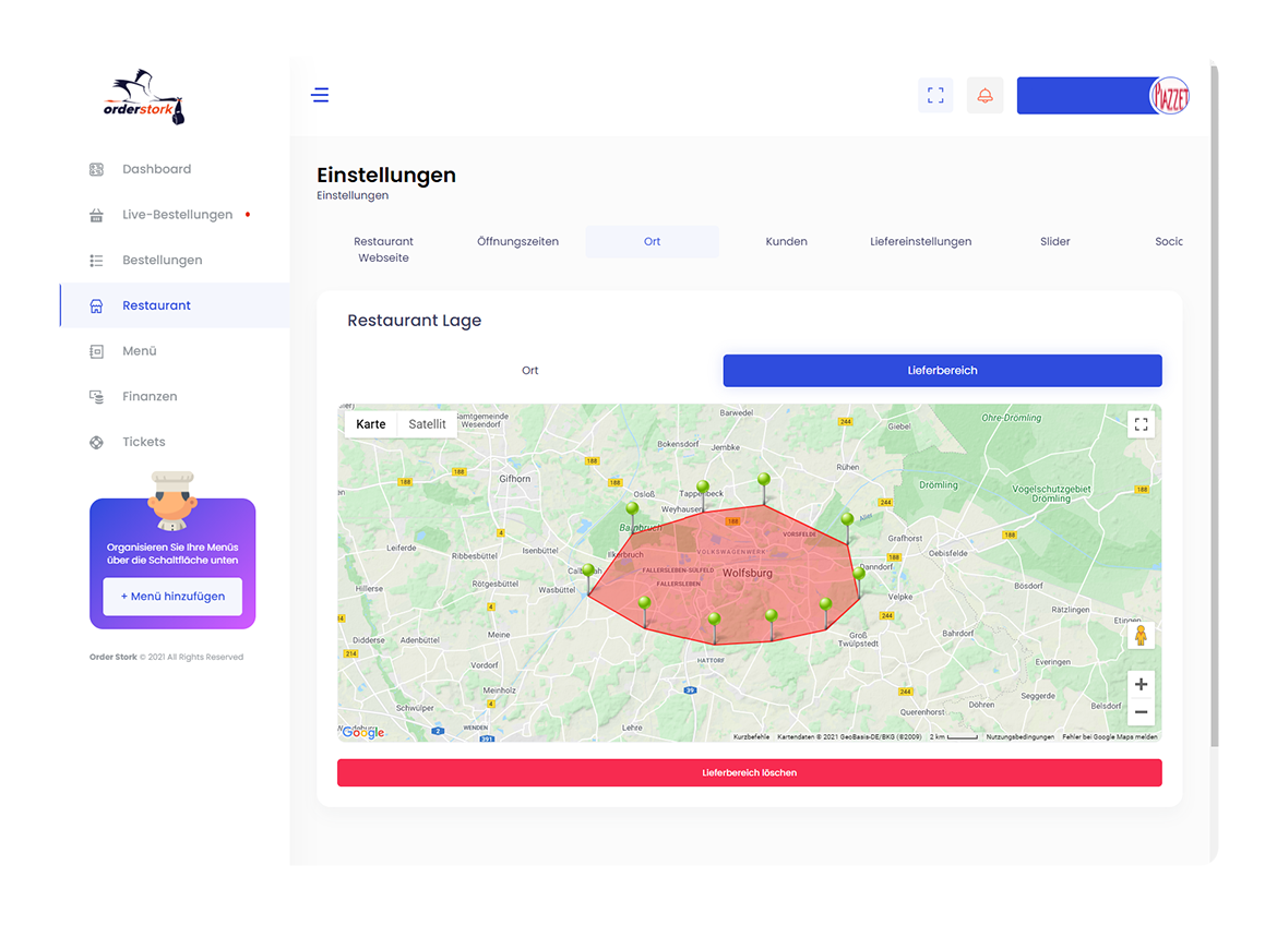 Definiere deinen Liefergebiet im Umkreis deines Geschäftes. Durch die Pin Funktion kannst du sogar einzelne Straßen mit einbeziehen oder außen vor lassen.