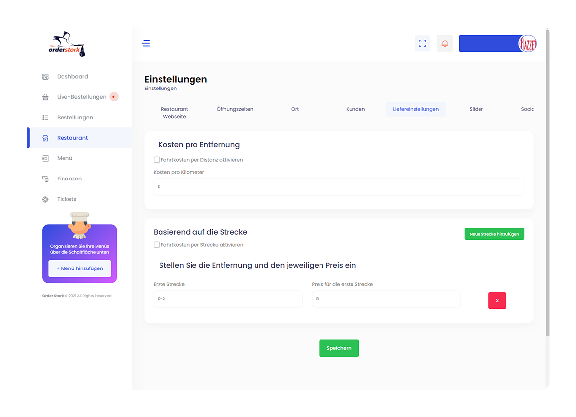 Bestimme für verschiedene Strecken Lieferkosten. Somit kannst du dein Liefergebiet vergrößern, weil die Fahrtkosten vom Kunden zu deinem Restaurant automatisch im Hintergrund berechnet werden.